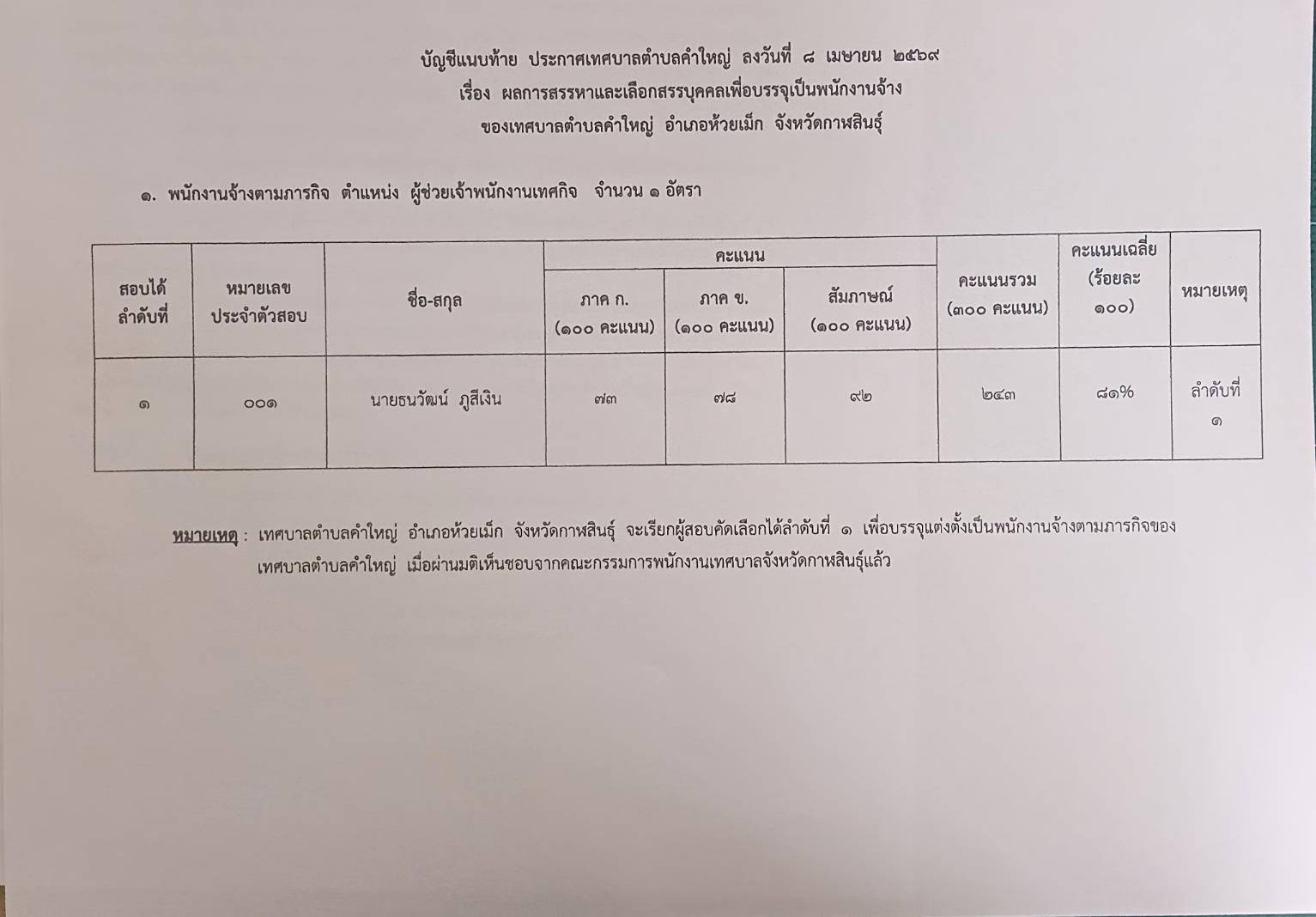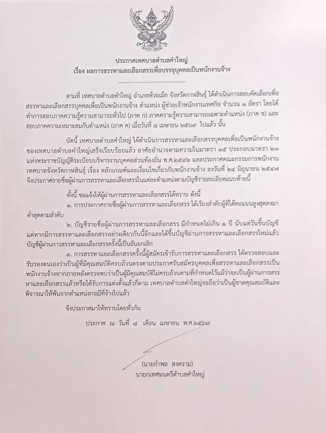 ประกาศเทศบาลตำบลคำใหญ่ เรื่อง ผลการสรรหาและเลือกสรรเพื่อบรรจุบุคคลเป็นพนักงานจ้าง