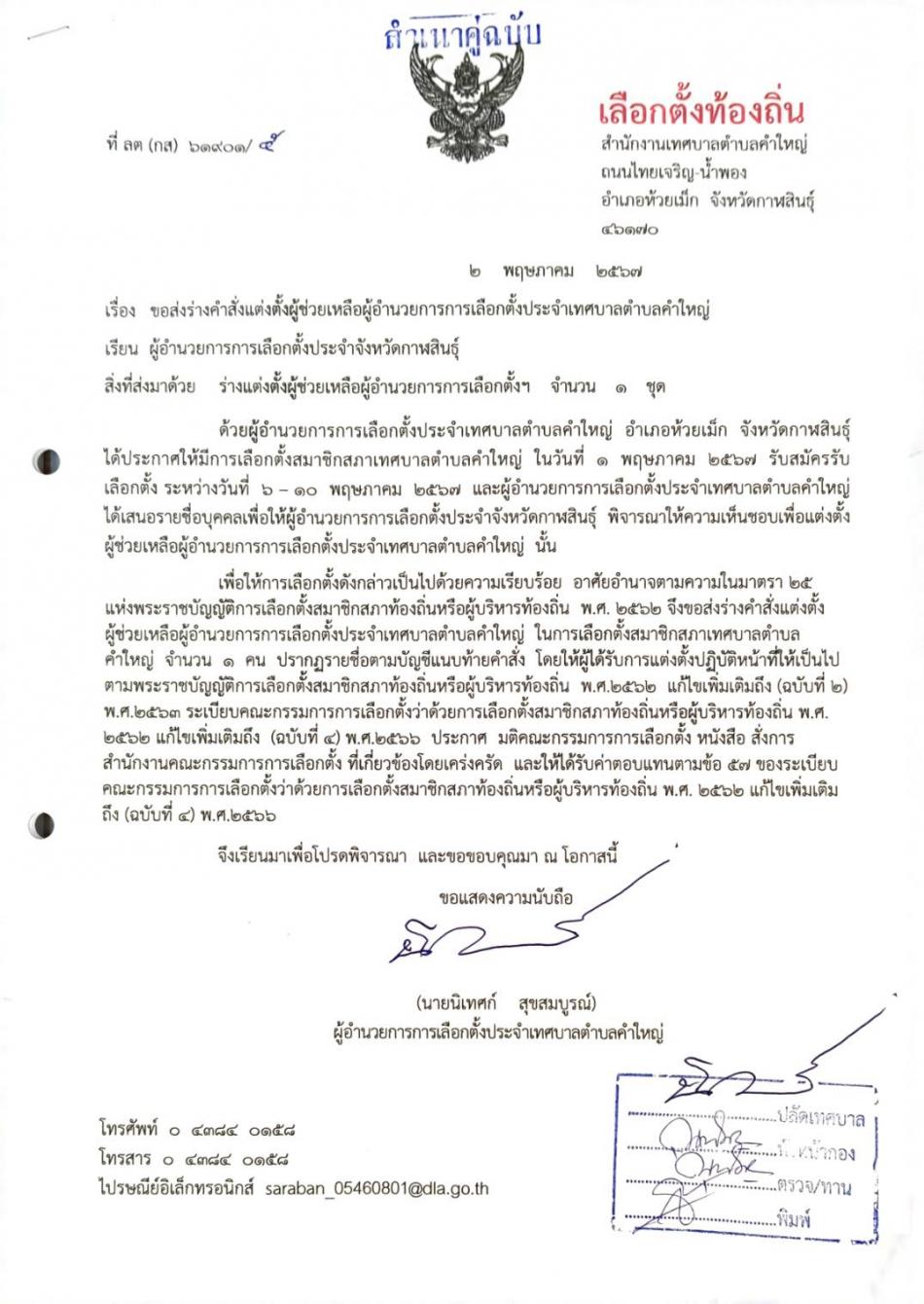 ประกาศผู้อำนวยการการเลือกตั้งประจำเทศบาลตำบลคำใหญ่ อำเภอห้วยเม็ก จังหวัดกาฬสินธุ์ เรื่อง ให้มีการเลือกตั้งสมาชิกสภาเทศบาลตำบลคำใหญ่ (กรณีแทนตำแหน่งที่ว่าง) [1 พฤษภาคม 2567]