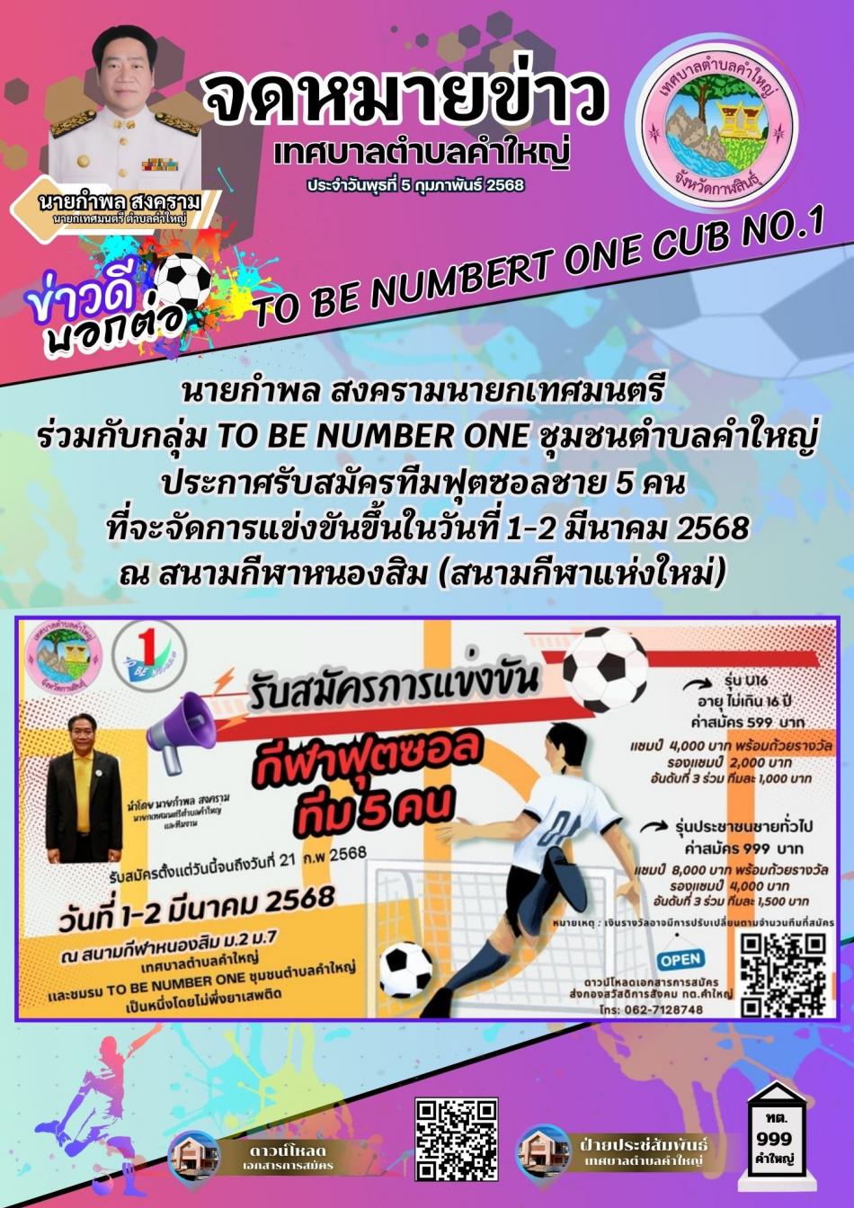 วันที่ 1 มีนาคม 2568 To Be Number One Cup การแข่งขัน ฟุตซอล 5 คน ณ สนาม หนองสิม บ้านคำใหญ่หมู่ที่ 7 โดยนายกำพล สงคราม นายกเทศมนตรี เป็นประธานเปิดการแข่งขันอย่างเป็นทางการ [5 มีนาคม 2568]
