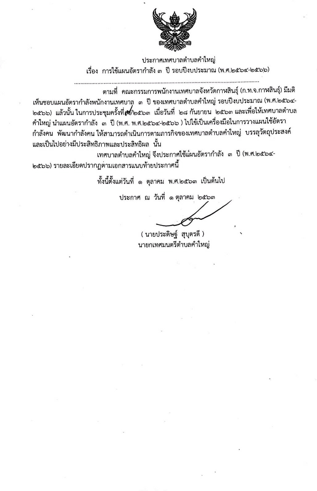 รายละเอียด : ประกาศเทศบาลตำบลคำใหญ่ เรื่องการใช้แผนอัตรากำลัง 3 ปี รอบปีงบประมาณ (พ.ศ. 2563-2564)
