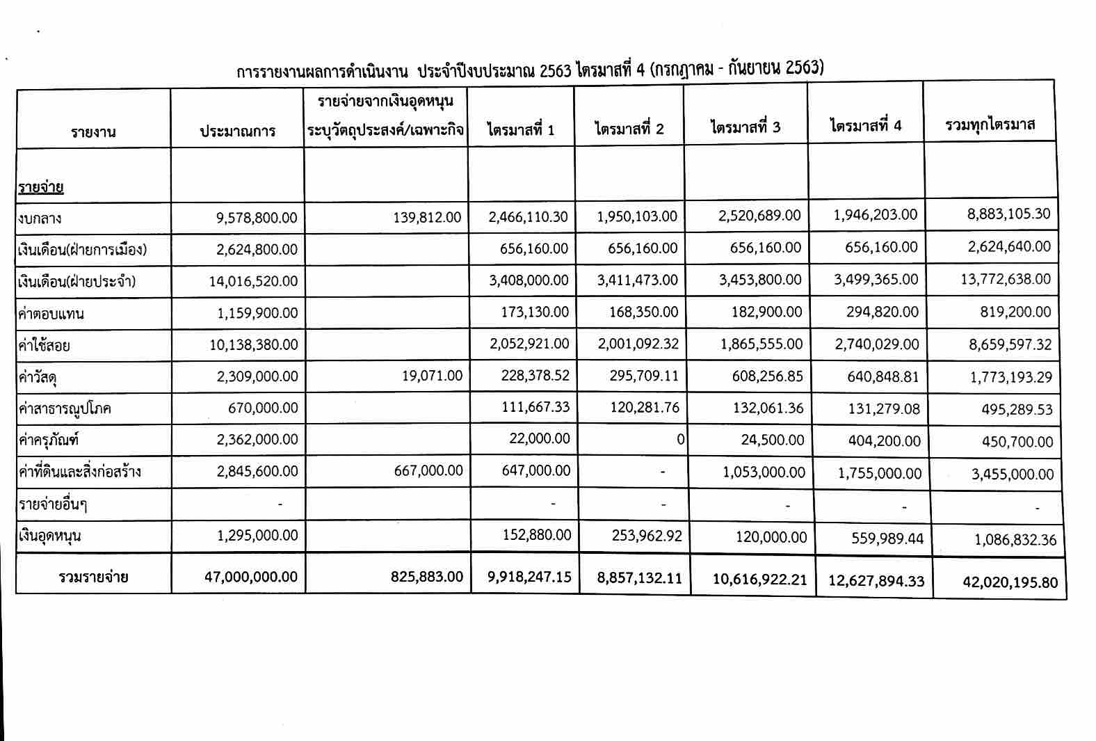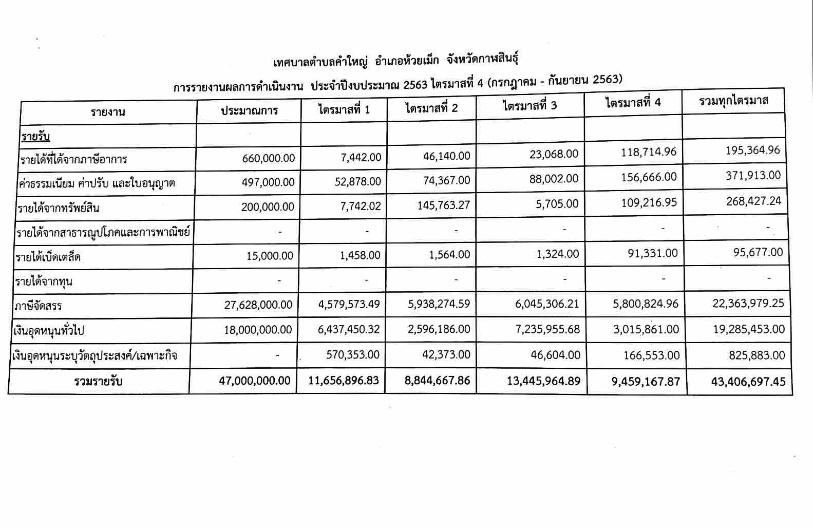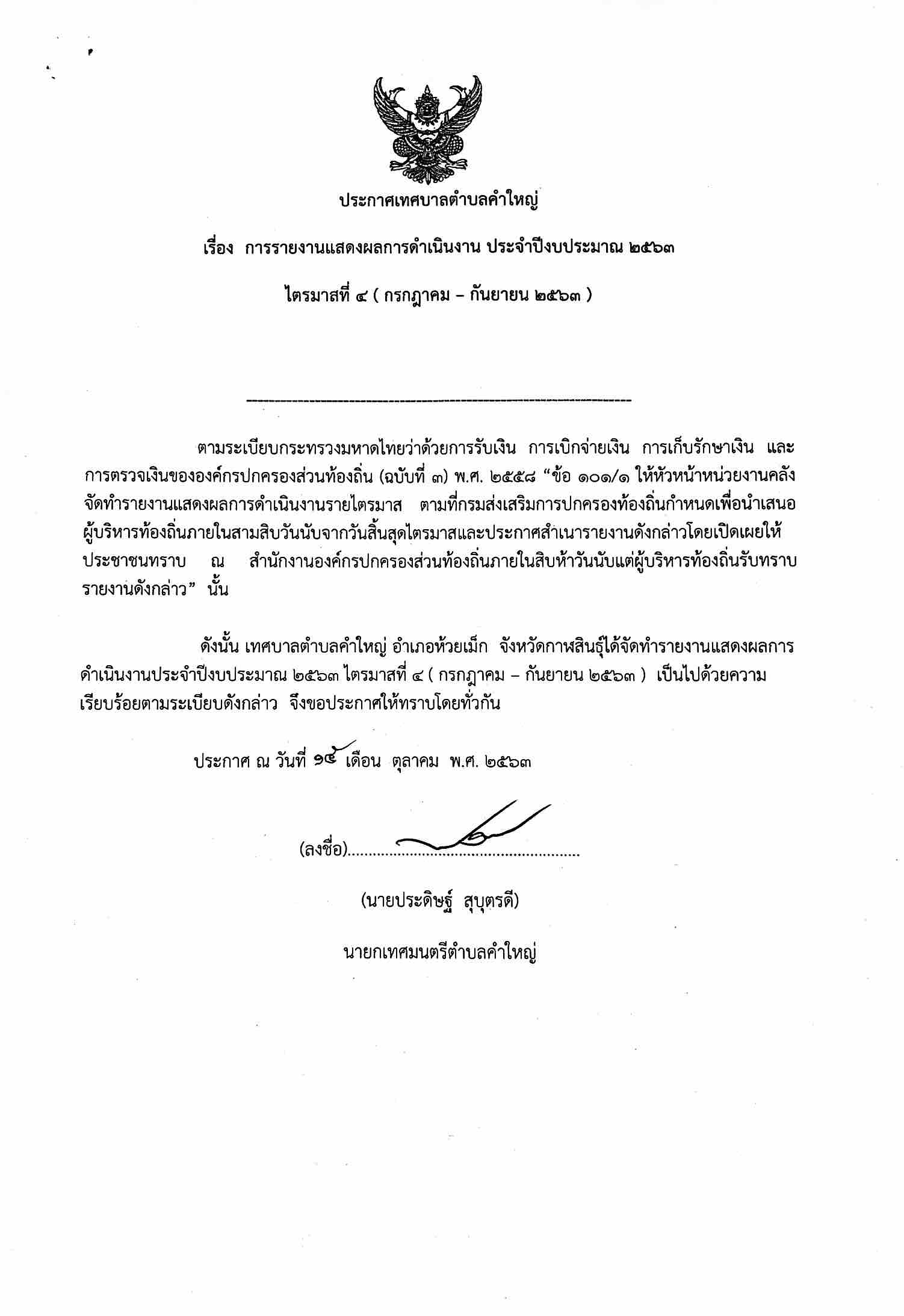 ประกาศเทศบาลตำบลคำใหญ่ เรื่องการรายงานแสดงผลการดำเนินงาน ประจำปีงบประมาณ 2563 ไตรมาสที่ 4 ( กรกฎาคม-กันยายน2563)