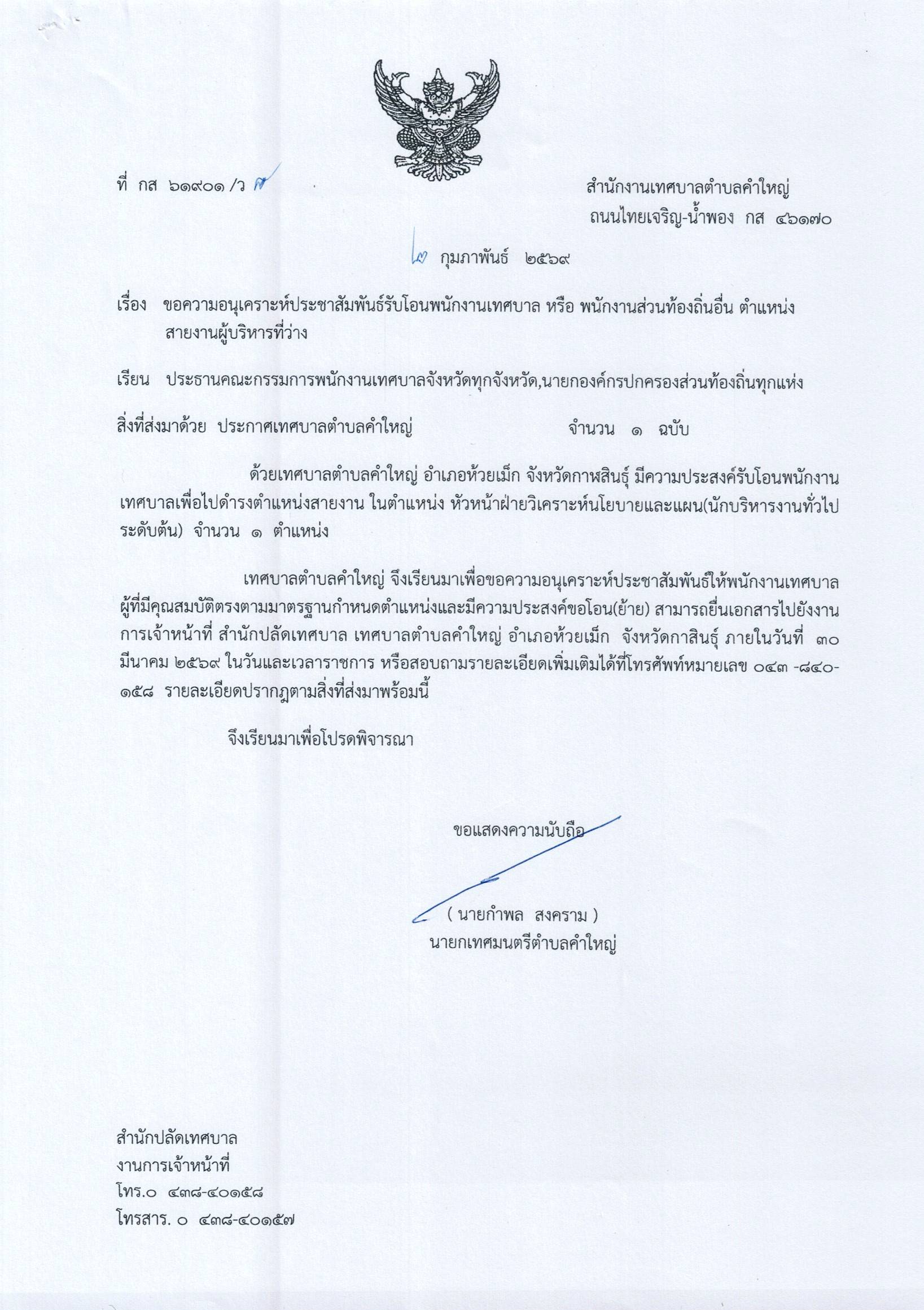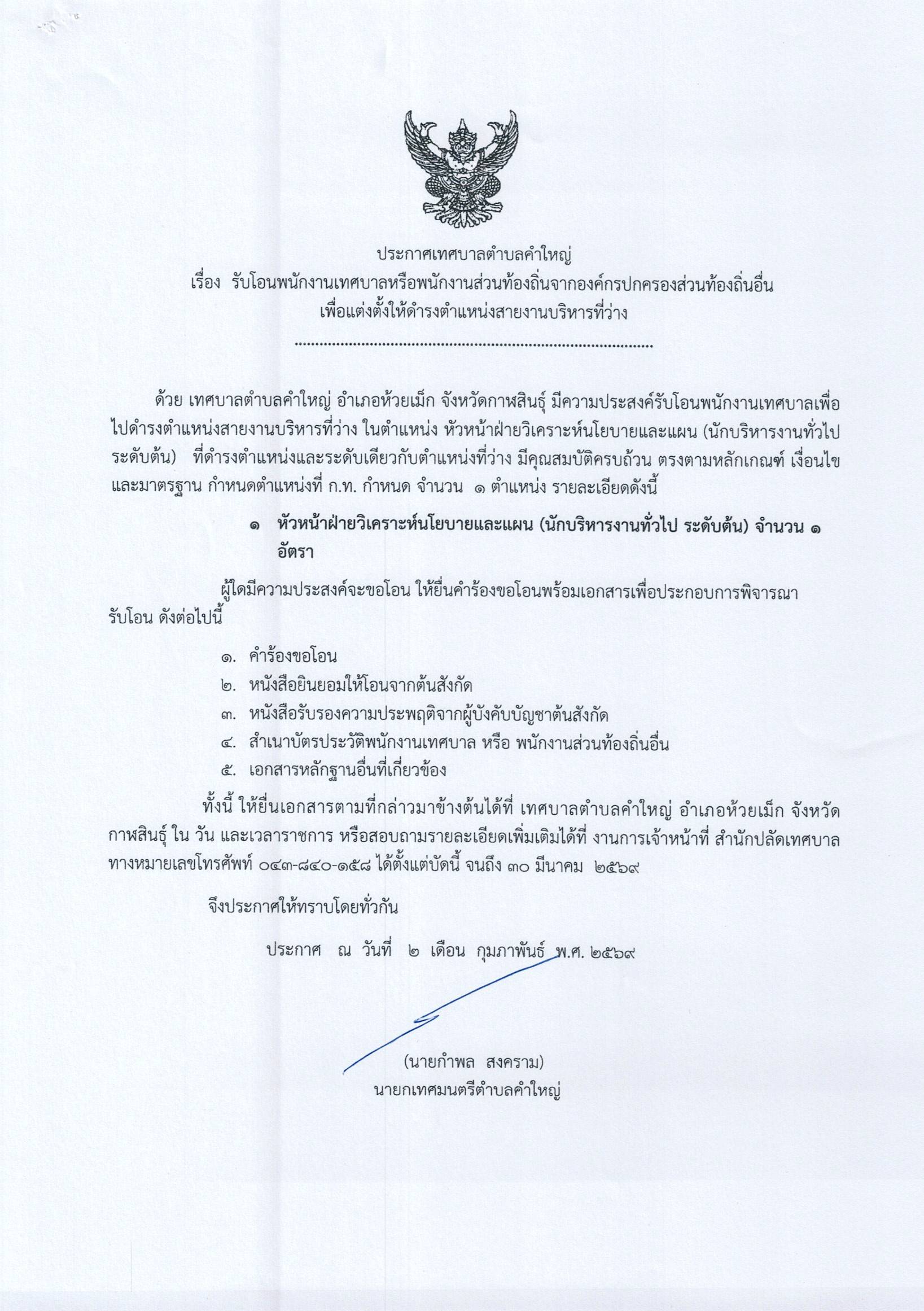 รับโอนพนักงานเทศบาลหรือพนักงานส่วนท้องถิ่นจากองค์กรปกครองส่วนท้องถิ่นอื่นเพื่อแต่งตั้งให้ดำรงตำแหน่งสายงานบริหารที่ว่าง