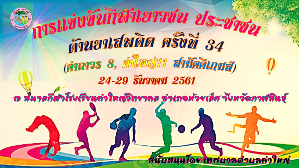 เทศบาลตำบลคำใหญ่...ขอเชิญชวน...ร่วมการแข่งขันกีฬาเยาวชน ประชาชน ต้านยาเสพติด ครั้งที่ ๓๔ "คำถาวร ๘ คำใหญ่ ๑๑ สามัคคีเกมส์" ประจำปี ๒๕๖๑ ณ สนามกีฬาโรง