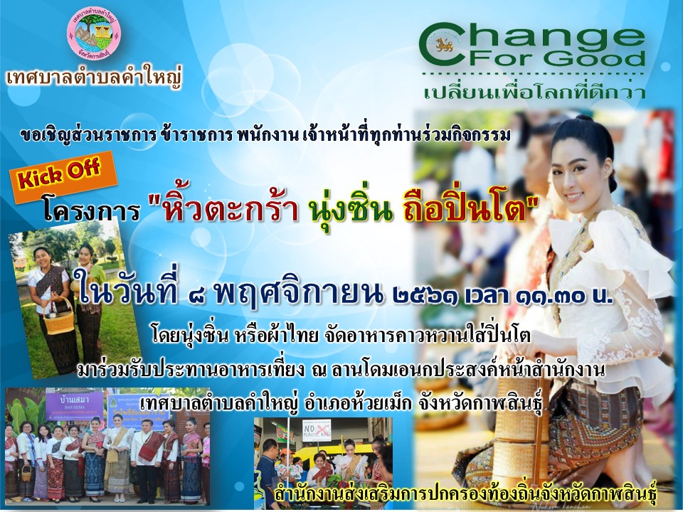เทศบาลตำบลคำใหญ่ ขอเชิญร่วมโครงการ"หิ้วตะกร้า นุ่งซิ่น ถือปิ่นโต" ประจำปีงบประมาณ ๒๕๖๒ ในวันที่ ๘ พฤศจิกายน ๒๕๖๑ ณ อาคารโดมอเนกประสงค์เทศบาลตำบลคำใหญ