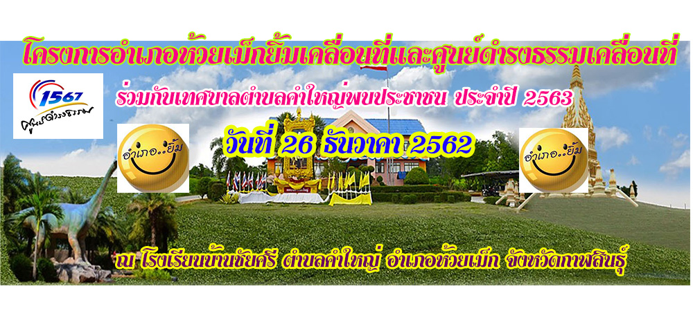 ขอเชิญร่วมงานโครงการอำเภอห้วยเม็กยิ้มเคลื่อนที่และเทศบาลตำบลคำใหญ่พบประชาชน ประจำเดือนธันวาคม 2562 ในวันที่ 26 ธันวาคม 2562 ณ โรงเรียนบ้านชัยศรี ตำบลค
